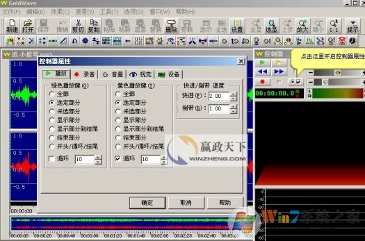 比如第1項,播放設(shè)置,可以定義這個按鈕播放全部波形、選定部分的波形、未選部分的波形、在窗口中顯示出來的部分波形等等,另外可以調(diào)整快進(jìn)和倒帶的速度哦;