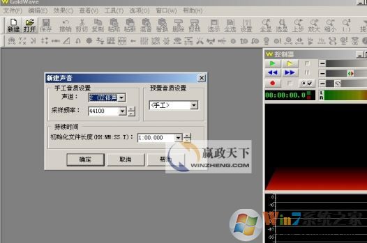 1、點擊主界面左上角的“新建”,新建一個音頻文件,在彈出的對話框里面,我們可以設(shè)置一些新建音頻文件的參數(shù),例如聲道、采樣頻率,音頻文件的長度等等;