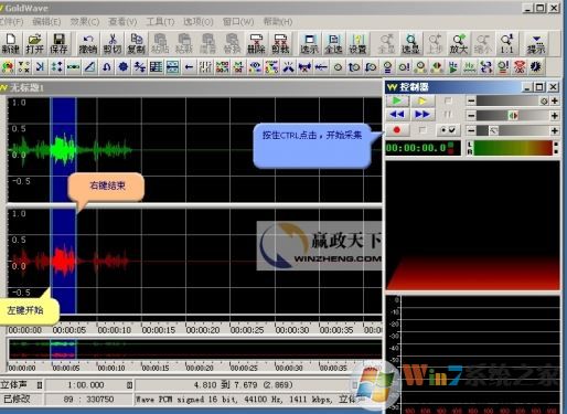 3、按住ctrl鍵,點擊控制器上的紅色圓點(錄音鍵)開始采集錄制完一段聲音后,可以選定一部分進(jìn)行編輯,方法是,鼠標(biāo)左鍵確定開始點,鼠標(biāo)右鍵確定終點;