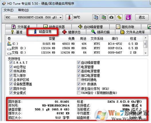 3、在HDTune硬盤檢測(cè)工具的磁盤信息中我們可以看到自己硬盤的固件版本、序列號(hào)、容量以及轉(zhuǎn)速等等,買電腦時(shí)可以用來測(cè)試,免得被導(dǎo)購(gòu)騙。,見下圖: