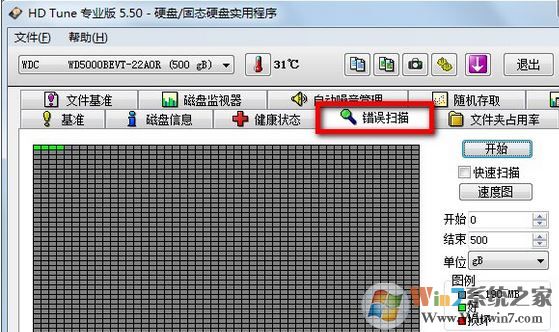 5、點(diǎn)擊HDTune硬盤檢測(cè)工具中的錯(cuò)誤掃描,我們來看一下硬盤中是否存在損壞的塊。