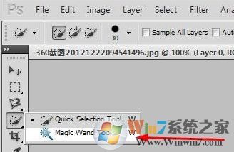 2、在工具欄選擇魔術(shù)棒工具,注意這個工具可能在子菜單中,你要仔細找找,當然,你是用其他的摳圖工具就更需要羽化了,你也可以使用其他工具摳圖,這里為了簡單就是用魔術(shù)棒了