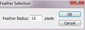5、接著要使用羽化功能了,如圖所示,在菜單欄上執(zhí)行:選擇---更改---羽化,彈出羽化對話框,設(shè)置羽化的像素為10,如果你的圖片很小,要設(shè)置羽化更小一些,比如設(shè)置為5,如圖:
