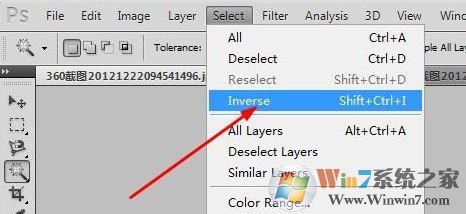 6、在菜單欄上執(zhí)行:選擇--反向;因為剛才選取的是logo的背景,我們的目的是logo,所以我們要執(zhí)行反向;