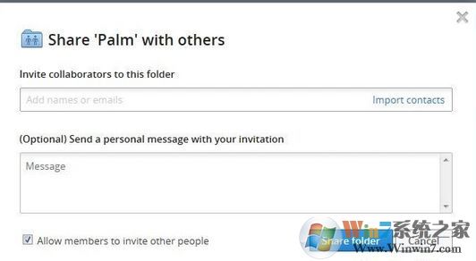 3、如果選擇共享現(xiàn)有的文件夾,點下一步會讓你選擇Dropbox上已經(jīng)有的文件夾,選好后,下一步就是邀請朋友來共享這個文件夾了,可以直接輸入郵箱地址,也可以導(dǎo)入你郵箱的聯(lián)系人來發(fā)出邀請,如圖:
