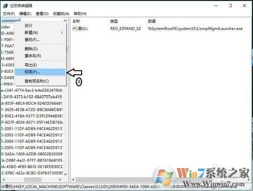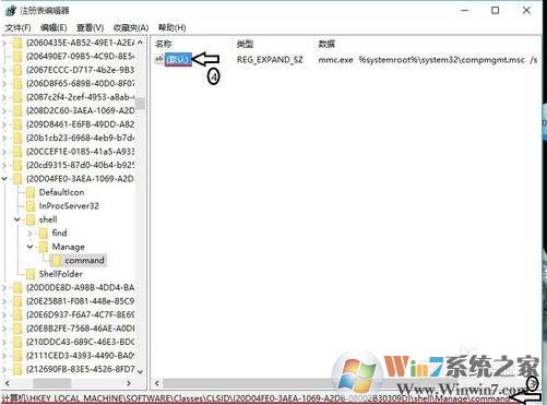 3、在彈出”注冊表“對話框中依次展開:HKEY_LOCAL_MACHINE\SOFTWARE\Classes\CLSID\20D04EF0-3AED-1069-A2D8-08002B30309D\shell\Manage\command\,雙擊”默認(rèn)“按鈕;