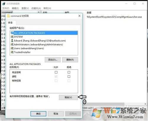 5、在權(quán)限中,點(diǎn)擊高級按鈕,如下圖箭頭所示;