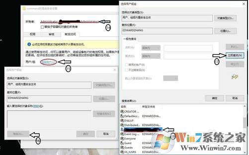 8、選擇”有效訪問“單擊”選擇用戶“在彈出的”選擇此對象類型“單擊”高級“,在彈出的”選擇用戶或組“對話框中,單擊”立即查找“按鈕,雙擊自己電腦的用戶名,更改自己使用賬戶的權(quán)限為”完全控制“;cncxm.com