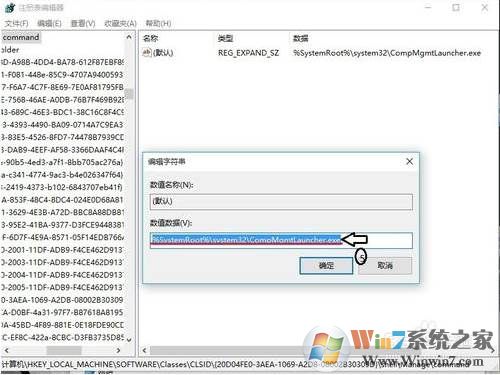 9、然后一路確定,這時再改“默認(rèn)”的數(shù)值編輯字符串“的對話框中,更改”%SystemRoot%\systme32\CompMgmtLaucher.exe“更改為 mmc.exe %systemroot%\system32\compmgmt.msc /s