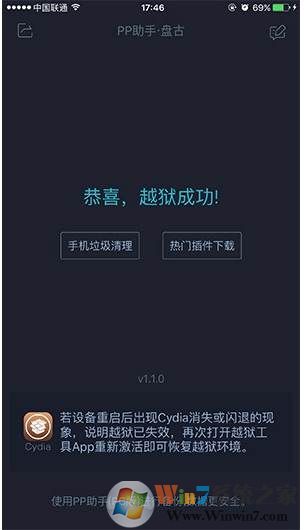 設(shè)備自動(dòng)重啟后,請(qǐng)?jiān)俅未蜷_【PP盤古越獄】App,查看越獄成功狀態(tài)。