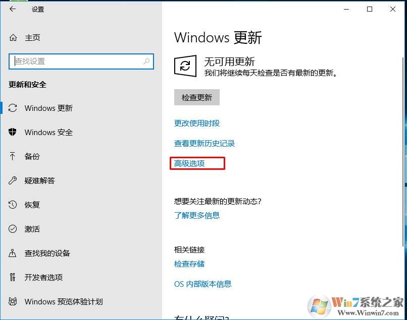 2、選擇Windows更新后,在右側(cè)點(diǎn)擊“高級(jí)選項(xiàng)”;