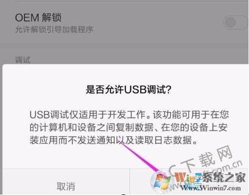 6、出現(xiàn)是否允許USB調(diào)試,我們選擇允許,之后就可以打開usb調(diào)試了。
