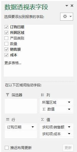 第二步,添加數(shù)據(jù)透視表字段。直接選中"字段"拖拽到下面幾個區(qū)域中即可