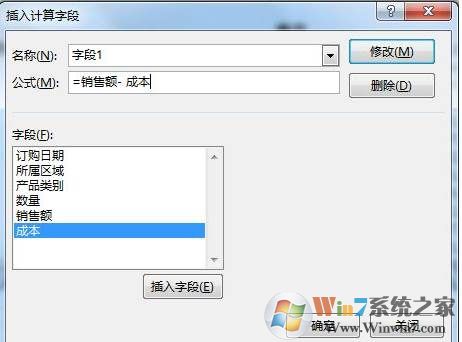 插入計算字段,在公式處輸入需要的公式。這里是:利潤=銷售額-成本;利用下面的插入字段將銷售額和成本字段插入公式之中。