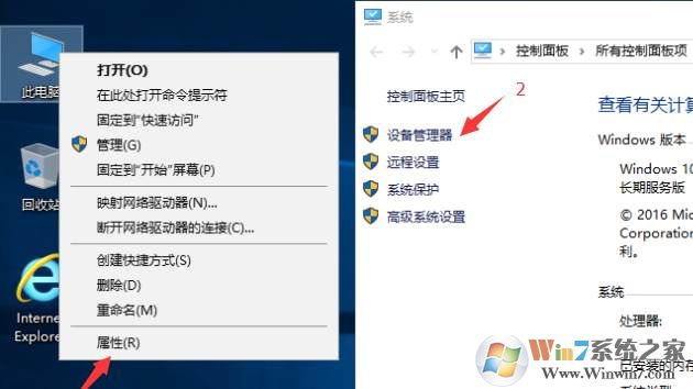 1、右鍵點(diǎn)擊桌面上的此電腦—屬性,然后打開系統(tǒng)信息,點(diǎn)擊設(shè)備管理器;