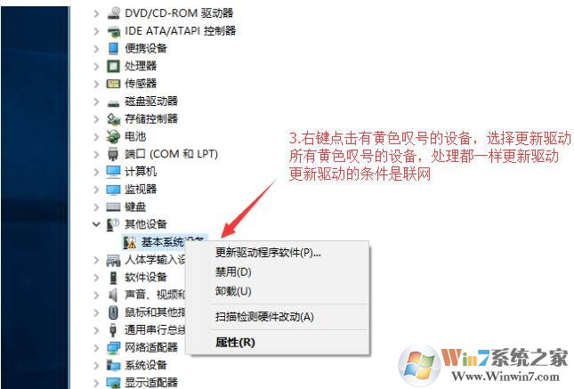 2、在設(shè)備管理器中,找到有黃色感嘆號的設(shè)備,這些都是沒有安裝驅(qū)動(dòng)的硬件,右鍵點(diǎn)擊,然后選擇更新驅(qū)動(dòng)程序軟件,如下圖所示:(注意:顯卡驅(qū)動(dòng)一般沒有嘆號但是也要更新驅(qū)動(dòng))