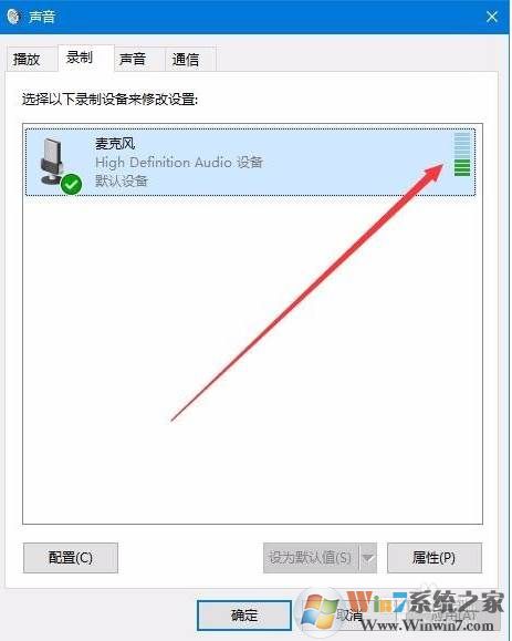 2、接下來,在打開的聲音窗口中,我們可以看到麥克風(fēng)圖標(biāo)右側(cè)的豎條有綠色的變化,這同樣可以說明我們的麥克風(fēng)是可以正常使用的。當(dāng)然,你要對麥克風(fēng)說話 吹氣都可以。