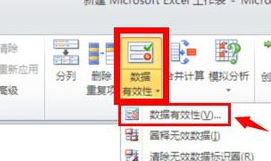 3、在數(shù)據(jù)菜單下面的工具中,找到“數(shù)據(jù)有效性”工具,點(diǎn)擊下拉符號(hào),在彈出來(lái)的功能菜單中選擇“數(shù)據(jù)有效性”。