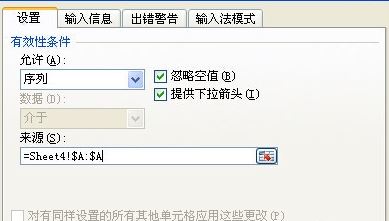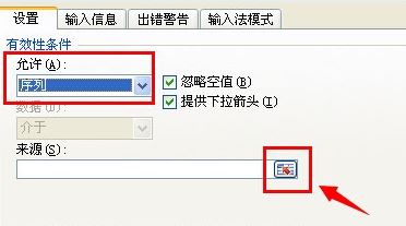 4、在數(shù)據(jù)有效性設(shè)置頁(yè)面,在允許條件中選擇“序列”,然后點(diǎn)擊來(lái)源右側(cè)的圖標(biāo)。