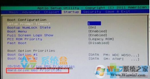 2、按→方向鍵移動(dòng)到Boot或Startup,按↓方向鍵選擇Hard Drive BBS Priorities,按回車(chē)鍵;