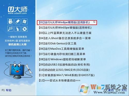 3、然后出現(xiàn)U大師啟動(dòng)界面,我們選擇PE進(jìn)入;