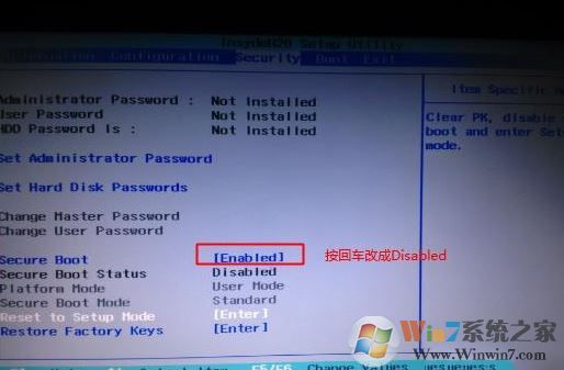 1、開機一直按F2或(FN+F2)進入BIOS,按→方向鍵切換到Security,選擇Secure Boot回車設(shè)置成Disabled;
