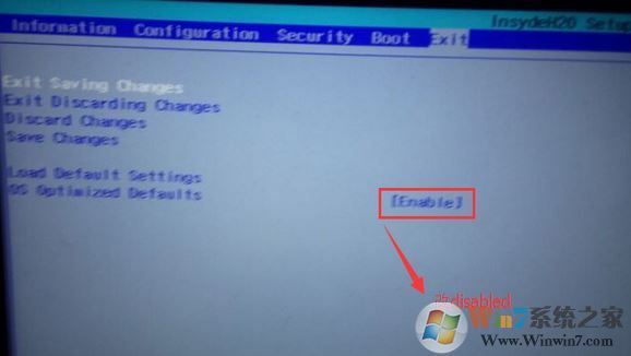 3、然后切換到Exit選,將os optimized defaults由默認(rèn)的enabled改成disabled;