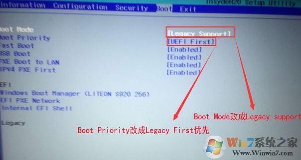 2、進(jìn)然后切換BOOT的選項(xiàng),將Boot Mode由默認(rèn)的UEFI改成Legacy Support,再將Boot priority默認(rèn)UEFI first改成Legacy firt,改legacy普通引導(dǎo)優(yōu)先;
