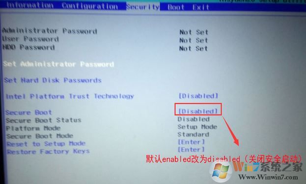 1、開機(jī)一直按F2進(jìn)入BIOS,,切換到Security選項(xiàng)將Secure Boot默認(rèn)enabled改成disabled,關(guān)閉安全啟動(dòng);