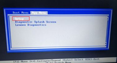 1、重啟筆記本按F12,按TAB鍵切換欄目到"App Menu",然后選擇"setup"進(jìn)入BIOS設(shè)置,或是看到lenovo或ThinkPad標(biāo)識后多次按Enter回車,聽到報警聲后等待下一畫面,然后按F1或Fn+ F1進(jìn)入BIOS主界面。如下圖所示;