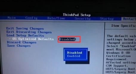 4、在Restart下,選擇OS Optimized Defaults回車,改成Disabled或Other OS,接著選擇Load Setup Defaults回車進(jìn)行加載,然后按F10保存設(shè)置,如圖: