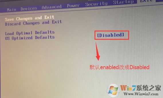 2、轉(zhuǎn)到Exit,把OS Optimized Defaults設(shè)置為Disabled;