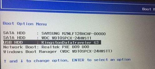 5、插入制作好的U盤啟動(dòng)盤,重啟按F12或FN+F12調(diào)出啟動(dòng)管理對(duì)話框,選擇USB HDD識(shí)別到U盤啟動(dòng)進(jìn)入PE,回車;