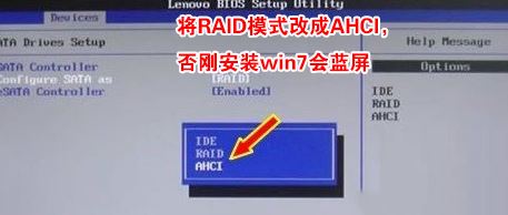 4、將鍵盤按方向左箭頭移動(dòng)Devices選項(xiàng),把鍵盤移動(dòng)ATA Drive Setup回車,將configure SATA as中默認(rèn)的raid改成ahci模式,否則安裝win7時(shí)會(huì)出現(xiàn)0x0000007b藍(lán)屏,因?yàn)閣in7中沒(méi)有集成raid硬盤驅(qū)動(dòng),然后選擇F10保存設(shè)置,在彈出的選項(xiàng)中選擇YES,如下圖所示;
