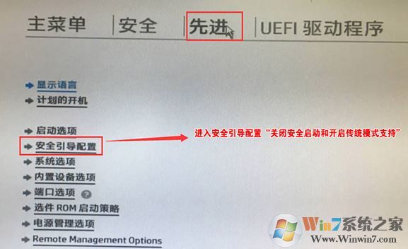 2、進(jìn)入BIOS后,將移動(dòng)鍵盤(pán)到“先進(jìn)”選項(xiàng)下,選擇"安全引導(dǎo)配置",按回車(chē)鍵進(jìn)入設(shè)置;