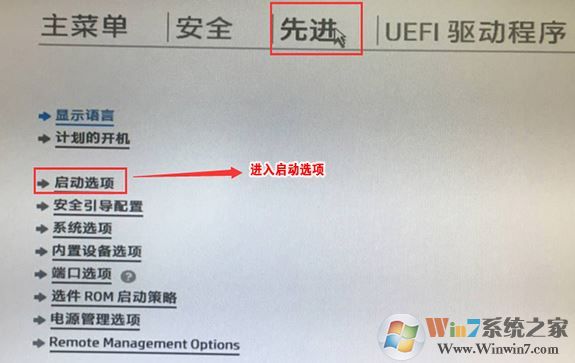5、F10保存重啟后再次開(kāi)機(jī)按ESC,然后選擇F10進(jìn)入BIOS設(shè)置,將鼠標(biāo)移動(dòng)“先進(jìn)”選項(xiàng)中,選擇"啟動(dòng)選項(xiàng)"后回車(chē)進(jìn)入,如下圖所示;