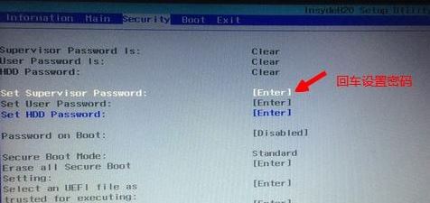 2、如果Secure Boot灰色無法設(shè)置,則轉(zhuǎn)到Security,選擇Set Supervisor Password回車設(shè)置密碼,再返回BOOT選項,將Secure BOOT默認enabled為disabled,(注:改完secure boot后再設(shè)置密碼為空即可,要不每次進BIOS都要設(shè)置)如下圖所示;