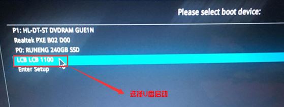 3、插入U盤啟動盤,重啟按ESC選擇識別到U盤啟動項,回車,如圖所示: