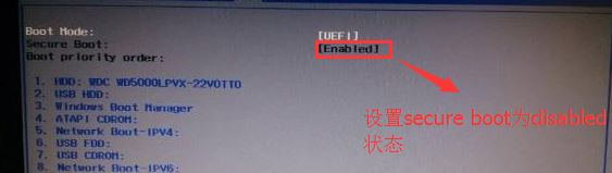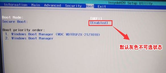 1、開機一直按F2進入BIOS,按F2進入BIOS界面,首先我們要關(guān)閉安全啟動(secure boot選項默認(rèn)為enabled),切換BOOT項后發(fā)現(xiàn)secure boot灰色不可選狀態(tài),如下圖所示;