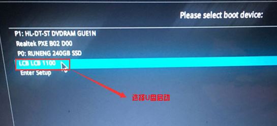 4、插入U盤啟動盤,重啟按ESC選擇識別到U盤啟動項,回車;