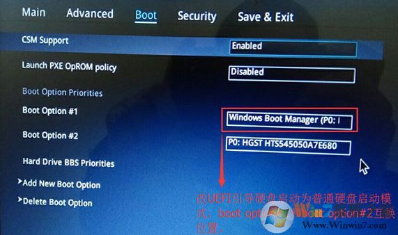 5、繼續(xù)把boot option#1選項(xiàng)改為普通引導(dǎo)的,boot option#1和boot option#2硬盤(pán)啟動(dòng)位置對(duì)換,設(shè)置第一啟動(dòng)項(xiàng)為普通硬盤(pán)引導(dǎo),帶Windwos Boot Manager的為UEFI引導(dǎo)分區(qū);