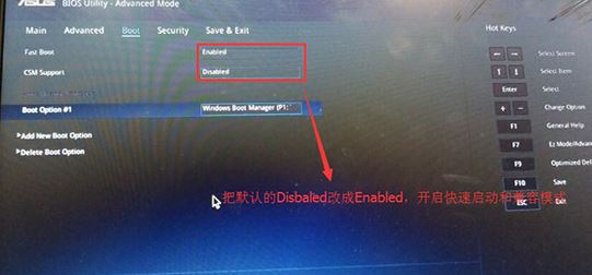 3、重啟后切換到BOOT的選項,分別把fast boot和csm support由disabled改成enabled,分別開啟快速啟動和兼容模式;