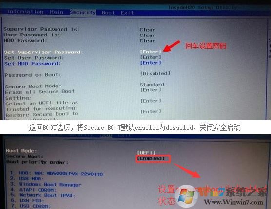 2、如果Secure Boot灰色無法設(shè)置,則轉(zhuǎn)到Security,選擇Set Supervisor Password回車設(shè)置密碼,再返回BOOT選項(xiàng),將Secure BOOT默認(rèn)enabled為disabled,(注:改完secure boot后再設(shè)置密碼為空即可,要不每次進(jìn)BIOS都要設(shè)置)如下圖所示;