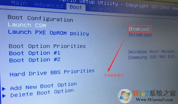 2、重啟后切換到BOOT的選項(xiàng),把Launch CSM由disabled改成enabled,開(kāi)啟兼容模式,,如圖: