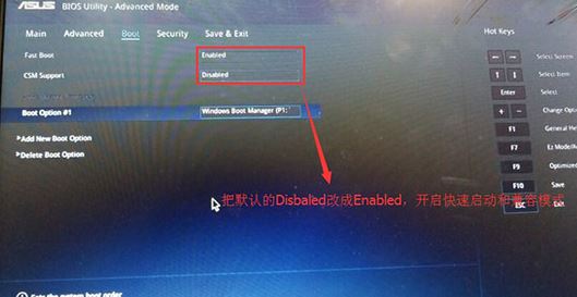 2、重啟后切換到BOOT的選項(xiàng),分別把fast boot和csm support由disabled改成enabled,分別開啟快速啟動(dòng)和兼容模式;