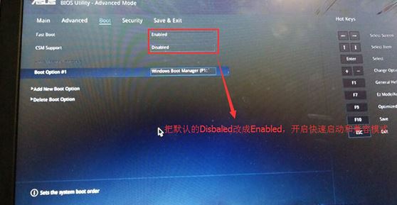 2、重啟后切換到BOOT的選項(xiàng),分別把fast boot和csm support由disabled改成enabled,分別開啟快速啟動(dòng)和兼容模式;
