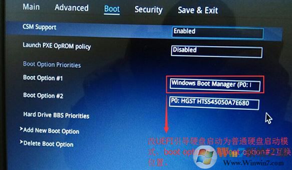 3、繼續(xù)把boot option#1選項(xiàng)改為普通引導(dǎo)的,boot option#1和boot option#2硬盤啟動(dòng)位置對換,設(shè)置第一啟動(dòng)項(xiàng)為普通硬盤引導(dǎo),帶Windwos Boot Manager的為UEFI引導(dǎo)分區(qū);