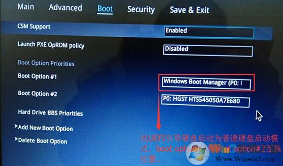 3、繼續(xù)把boot option#1選項(xiàng)改為普通引導(dǎo)的,boot option#1和boot option#2硬盤啟動(dòng)位置對(duì)換,設(shè)置第一啟動(dòng)項(xiàng)為普通硬盤引導(dǎo),帶Windwos Boot Manager的為UEFI引導(dǎo)分區(qū);