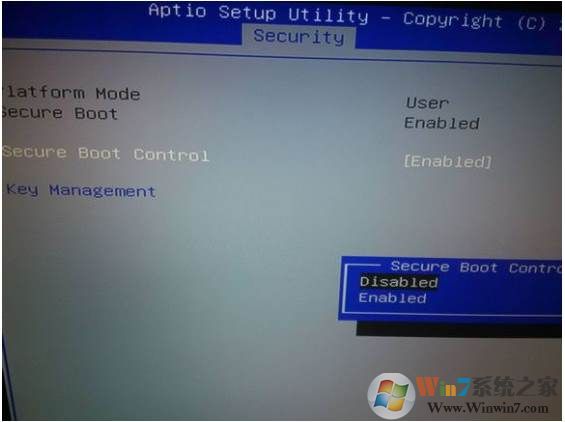 1、重新啟動電腦后我們按F2進入到BIOS,進入后進入security菜單,把菜單下的secure boot 的enable改成disable;(這個步驟是關(guān)閉安全啟動)