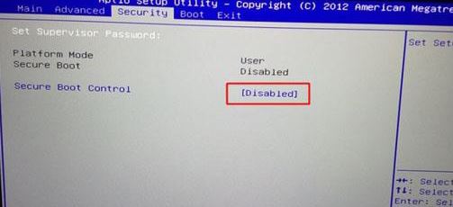 1、重啟筆記本按F2進入BIOS設(shè)置,在Security下把Secure Boot Control設(shè)置為Disabled,如下圖所示;